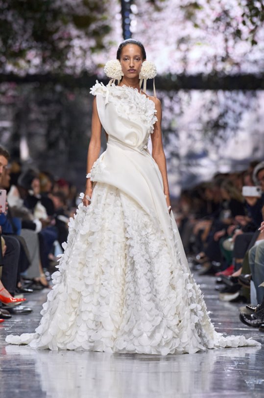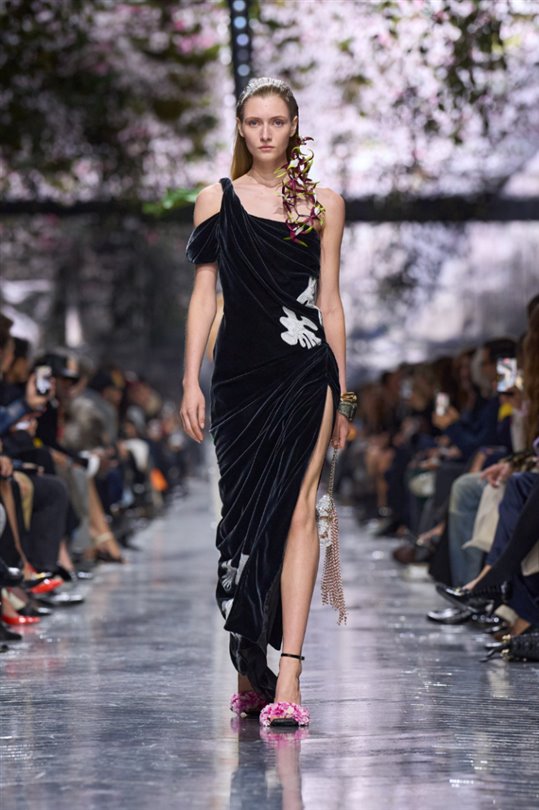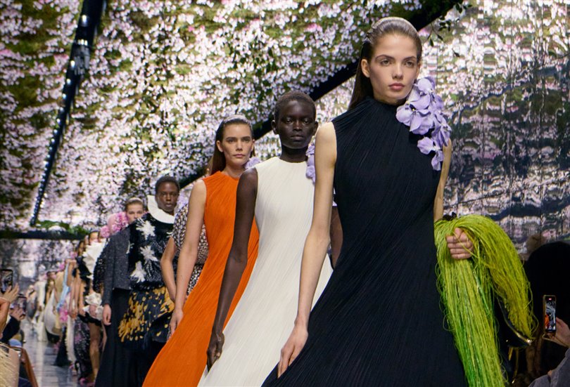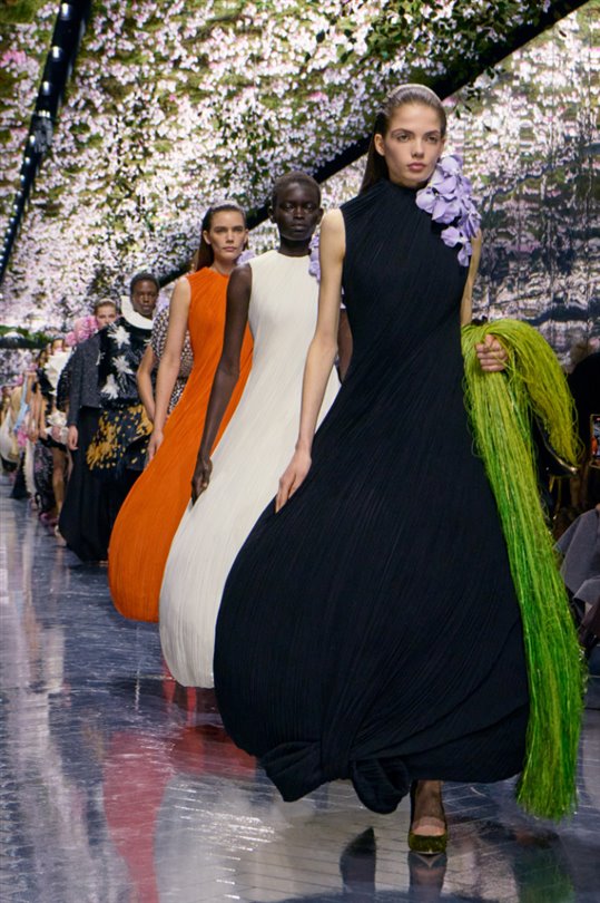 Koleksiyondaki yarı saydam, kıvrımlı üst kısımlar deniz kabukları kadar hassastı, tüylü pullar ise kelebek kanatlarının aşırı makro yakın çekimlerini andırıyordu. Vücudu yumuşak kıvrımlarla saran örgü mini pelerinler, Dior'un ‘çiçek kadınları’na yeni bir yorum getirirken, markanın kurucusu Christian Dior’un en sevdiği çiçek olan müge çiçeğinin büyütülmüş versiyonlarını andıran çan şeklindeki elbiseler de aynı etkiyi yaratıyordu.