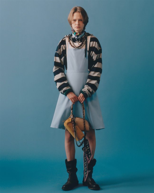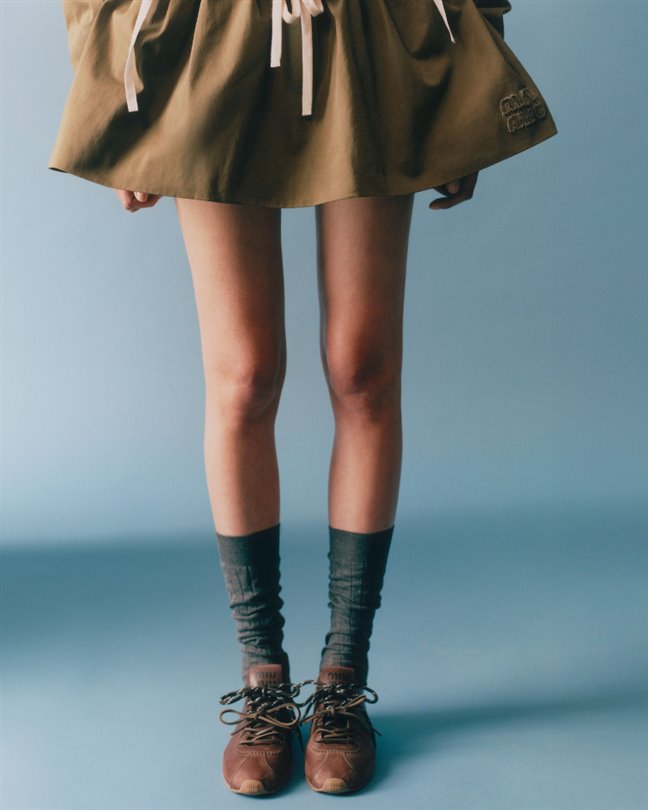 Koleksiyonda; Miu Miu’nun ikonik parçaları yeni başlangıçlar için yeniden yorumlanıyor. Logolu pamuk kanvas, fermuarlı ceketler; şortlar, pantolonlar ve balon formdaki mikro mini etekler haki ve pudra tonlarında, düşük bel kesimlerle kullanılıyor. Açık tonlardaki önlük elbiseler ve haki seçenekler; çizgili rugby ve polo tişörtlerin üzerine ya da koyu asker yeşili mumlu ceketlerin altına katmanlanıyor. Üniforma tonları ve kırmızı renkte tasarlanan küçültülmüş trikolar ile pamuk poplin gömlekler ise sıcaklık hissi sunarken, oranlarla oynayan zekice bir tasarım anlayışını yansıtıyor.