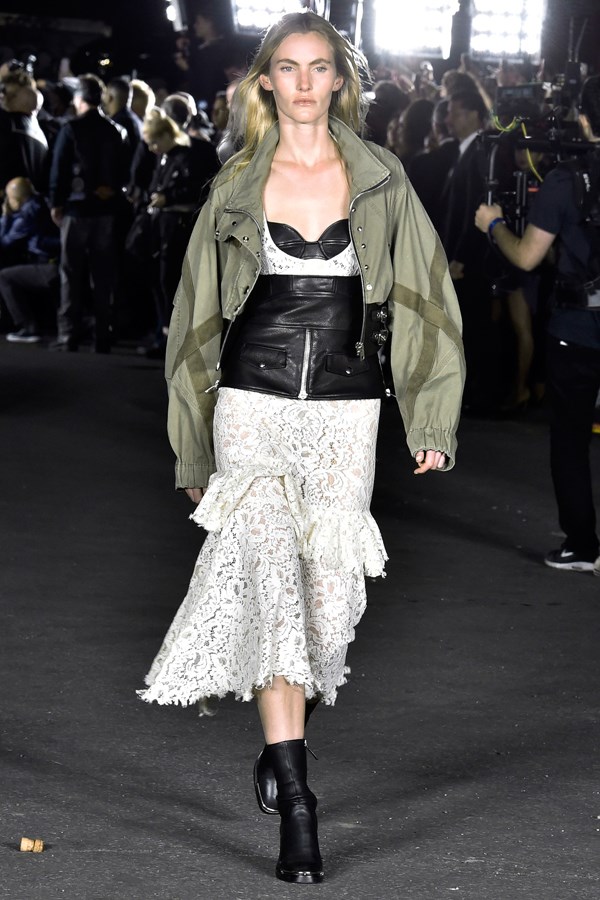 Kaia Gerber’in açılışını yaptığı Alexander Wang defilesi New York’ta en merakla beklenen defilelerden biriydi. Beyaz, gümüş, gri ve siyah renklerle devam eden ve deri detayların, asimetrik kesimlerin klasik asi ve grunge Wang tarzıyla birleştiği koleksiyonda toprak tonları ve haki yeşili gibi renkler de sıkça kullanılmış. Diz üstü file çorapların üstüne giyilen tek omuz bol kesim kazaklar ve altında stiletto ile Wang kadını asi olduğu kadar seksi ve feminen olmayı da bu sezon temsil ediyor.