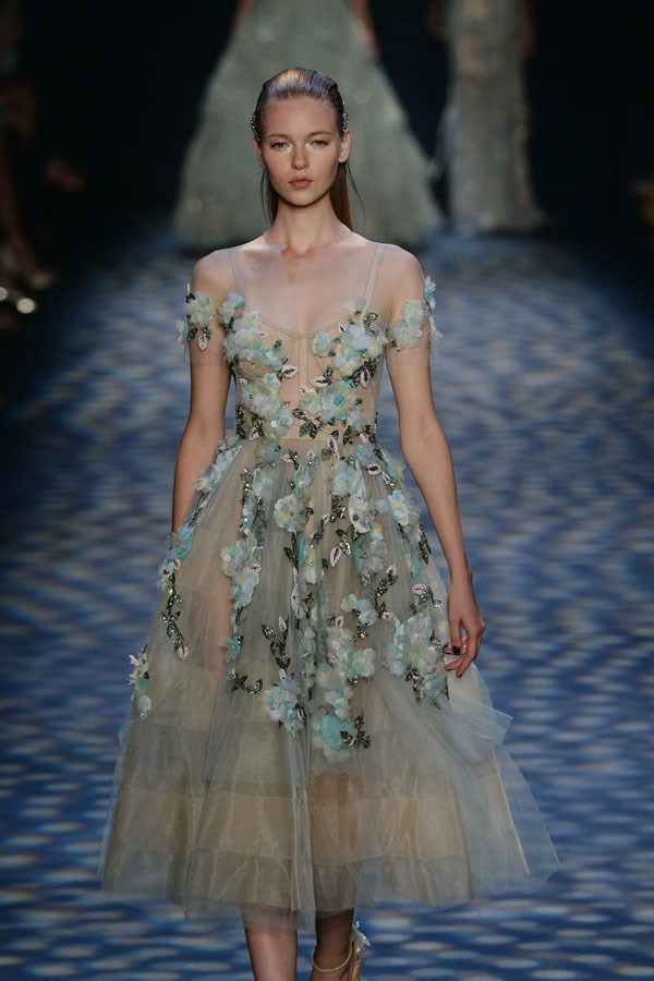 İncecik şifon ve transparan kumaşları kat kat kullanarak rüya gibi bir koleksiyon ortaya koyan Marchesa’da renkler de genellikle pudra ve soğuk tonlar. İşleme detaylar ile parçalar zenginleştirilse de abartıya kaçılmamış. Etekler genellikle önümüzdeki sezon tütü etek modasının devam edeceğinin sinyallerini veriyor.