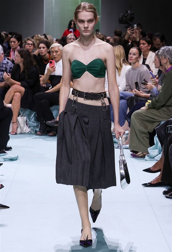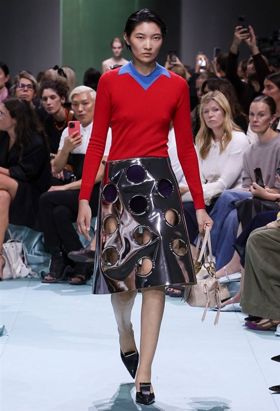 Prada'nın İlkbahar 2025 erkek giyim koleksiyonu izleyicilerden mevcut maddi dünyaya dair algılarını sorgulamalarını isterken, markanın perşembe günü Milano'da sunulan İlkbahar 2025 kadın koleksiyonu tüm trendleri ve ruh hallerini aynı potada eritiyor.