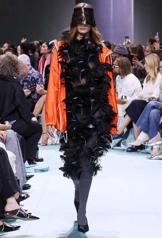 Miuccia Prada ve Raf Simons, bu koleksiyonla neyin bir arada yürüyüp gidemeyeceğine dair ‘kuralları’ yeniden yazıyor. Süet gündelik paltolar gibi Batının vazgeçilmezleri, galaksiler arası krom etekler, böcek gözlü gözlükler ve zincirler; koleksiyonun sevimli tuhaflığını ön plana çıkarıyor.