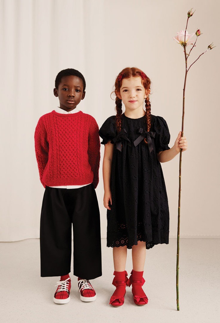 Rocha uzun zamandır oran-orantılarla, silüetlerle oynuyor ve Rocha’nın yaptığı ilk çocuk gyim koleksiyonunda da şık gömlekler ve fırfırlı elbiseler gibi klasik tasarımlarının minyatür versiyonları bulunuyor. Selanik örgüsünden kalp şeklinde inci düğmeli kazak, yumuşacık eşofman altları ve sweatshirtlere ek olarak pembe çiçek desenli geri dönüştürülmüş polyesterden boydan boya düğmeli kabarık bir mont da bulunuyor. Tüm koleksiyonda göze çarpan ekose deseni burada da işçi tulumunda karşımıza yeniden çıkıyor. Çocuk koleksiyonunun büyük çoğunluğu 2-8 yaş aralığında satın alınabilecek.