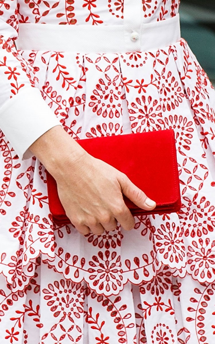 Düşes, kırmızı beyaz Alexander McQueen elbisesini kırmızı bir clutch ve aynı renkte bir ayakkabıyla tamamlamıştı.