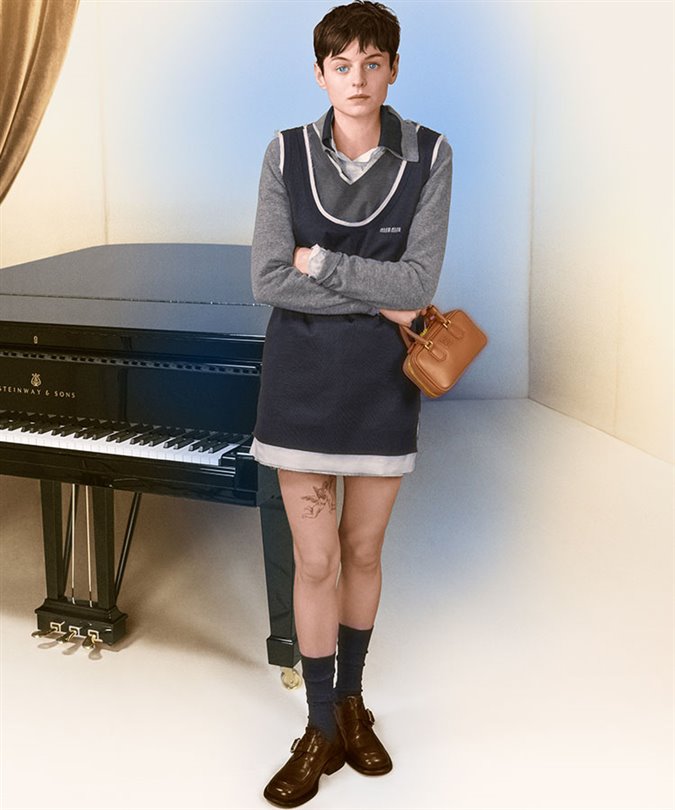 Lengua tarafından fotoğraflanan ve oyuncu Emma Corrin ile hayat bulan Miu Miu Yeni Yıl Kampanyası, antika esintili kış kartpostallarına sade ama bir o kadar dikkat çekici bir atıfta bulunuyor. Duvar ve zemin soluk ipek kumaşla kaplıyken; kanepe, berjer, kuyruklu piyano gibi zengin arka plan ögeleri hem soyut ve zarif bir alanı tamamlıyor hem de ışık ve gölge oyunu yaratıyor.