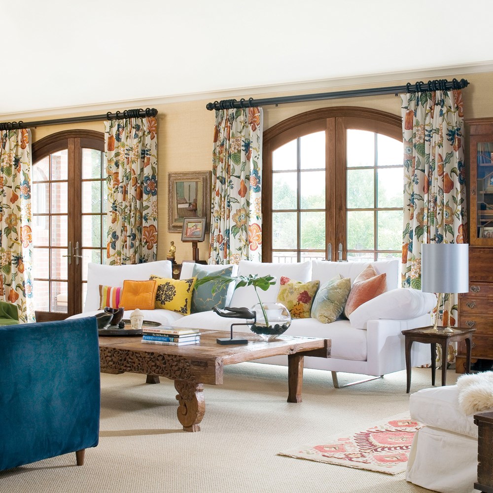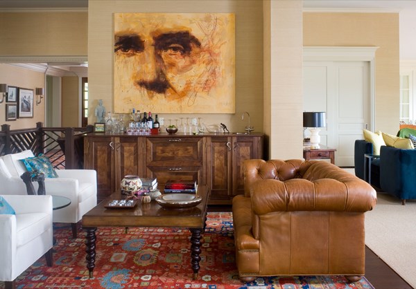 Çok sayıda farklı renk ve desenin bir arada kullanıldığı bu geniş oturma odası, buna rağmen bir karmaşa ve renk yığınından ziyade zarif bir armoniyi çağrıştırıyor. Olağanüstü güzellikteki ve müthiş bir ahşap işçiliğiyle üretilmiş mobilyalara eşlik eden aksesuarlar bu armoniyi tamamlıyor.