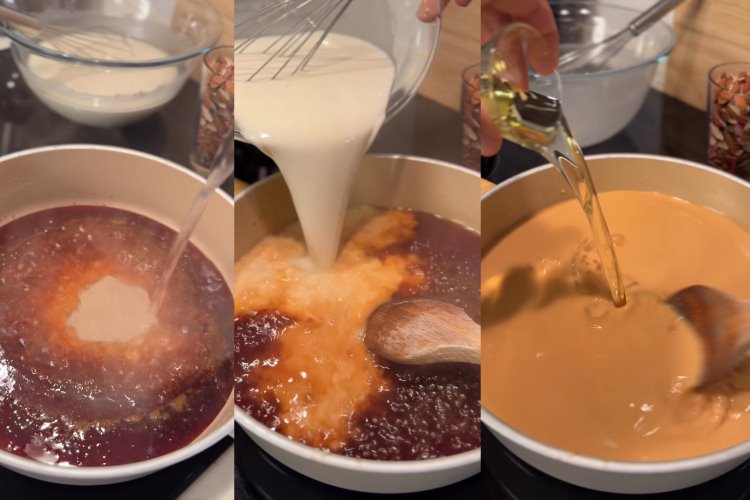 Geniş bir tencerede toz şekeri eritiyoruz. Kıvamını alınca iki bardak sıcak suyu ilave ediyoruz.