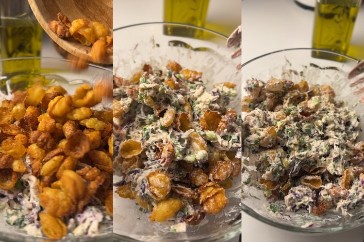 Son olarak, servis öncesi makarnaları ilave ediyoruz. (Çıtırlığı daha uzun kalacaktır)