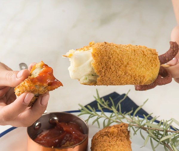 6. Yumurta sarısını, unu ve ekmek kırıntılarının her birini ayrı bir kap içerisine alın. Önce una sonra yumurta sarısına ve daha sonrada patatesli cipse batırın.