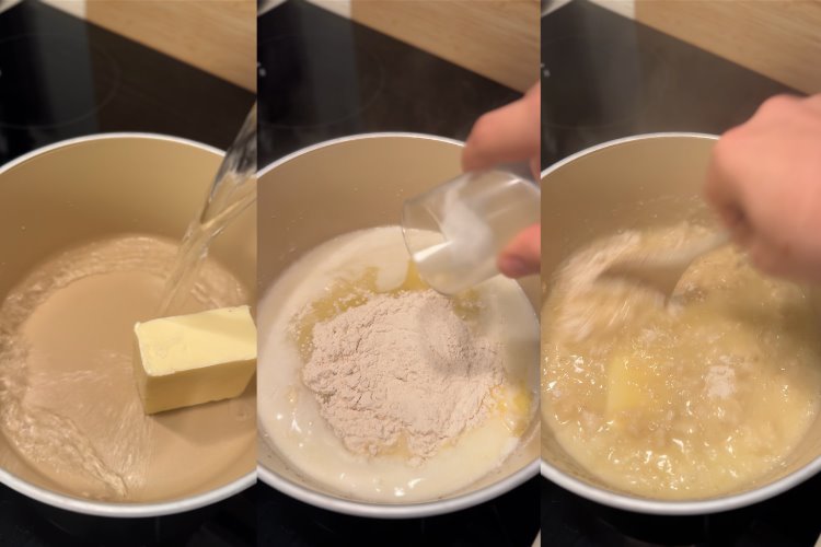 Yağı ve suyu tencerede ısıtıyoruz. Daha sonra içine unu ekleyip güzelce hamur haline getiriyoruz.