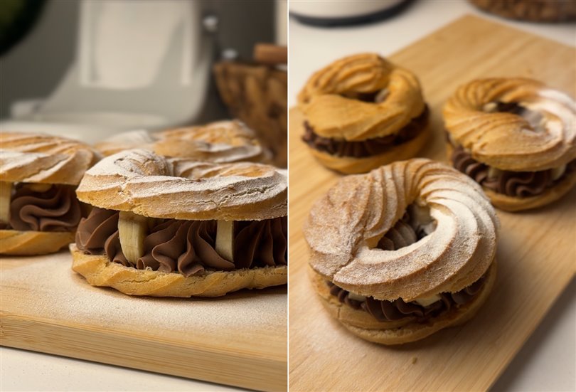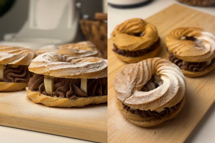 Bir yarısının üzerine çikolatalı krema, muz ve badem koyduktan sonra diğer yarısını üstüne koyuyoruz.