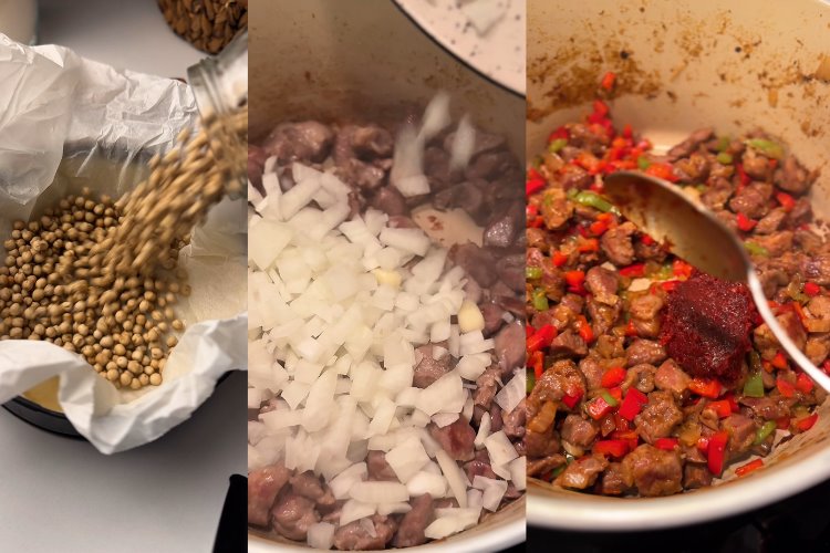 Et için; soğan ve eti yağda pişirmeye başlıyoruz. Et suyunu bırakmaya başlayınca orta ateşte kapağını kapatıp suyunu tekrar çektiriyoruz. Etler yumuşayınca da küpler halinde doğradığımız biberi, domatesi, salçayı, baharatları ve suyunu ilave ediyoruz. Bu şekilde diğer malzemeler de pişince tamamdır.
