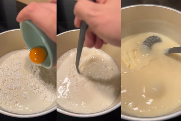Krema için süt, şeker, nişasta ve yumurtayı iyice karıştırıp orta ateşte pişiriyoruz. Göz göz olunca ocaktan alıp vanilya ve tereyağını ekliyoruz.
