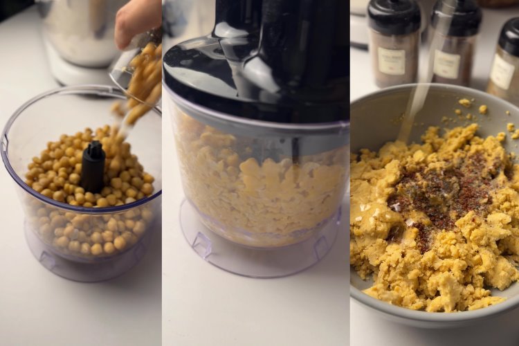 Haşlanmış nohutları robottan geçiriyoruz. Püre gibi olması için sonrasında ezebilirsiniz. Baharat ve yağ ile karıştırıyoruz.