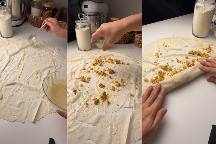 Yufkamızı tam açıp içine önce sosu, sonra da malzemeyi dağıtıyoruz. Çok sıkı olmayacak şekilde rulo yapıyoruz.