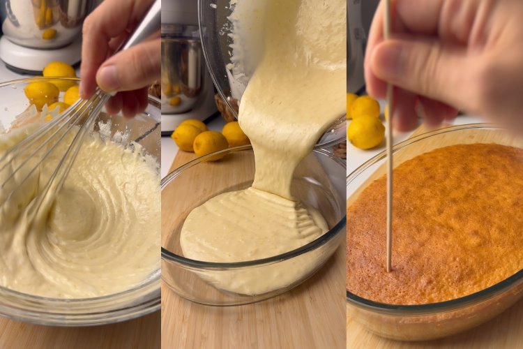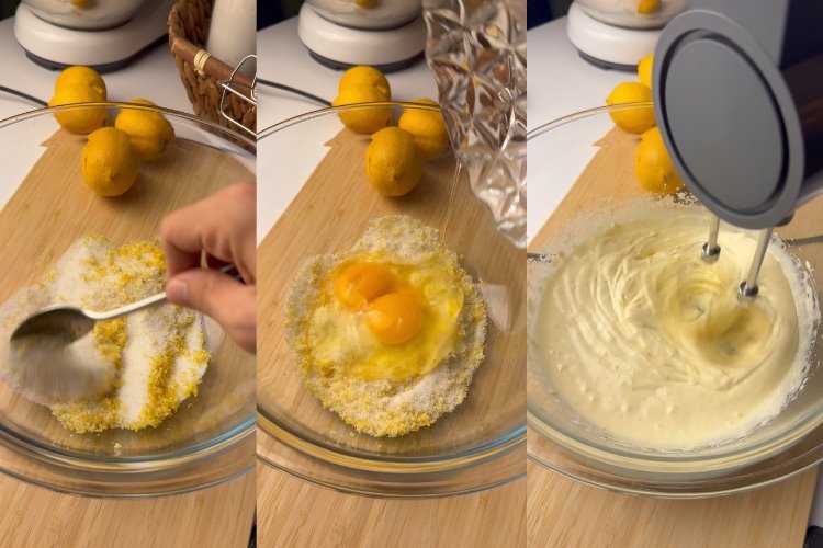 Kek için; geniş bir kapta tüm şekeri limon kabuğuyla karıştırıyoruz. Yumurtaları ekleyip köpük köpük olana kadar çırpıyoruz.
