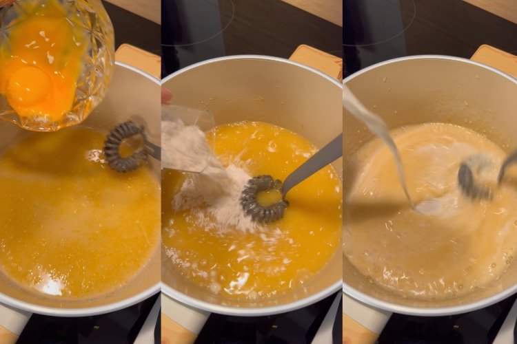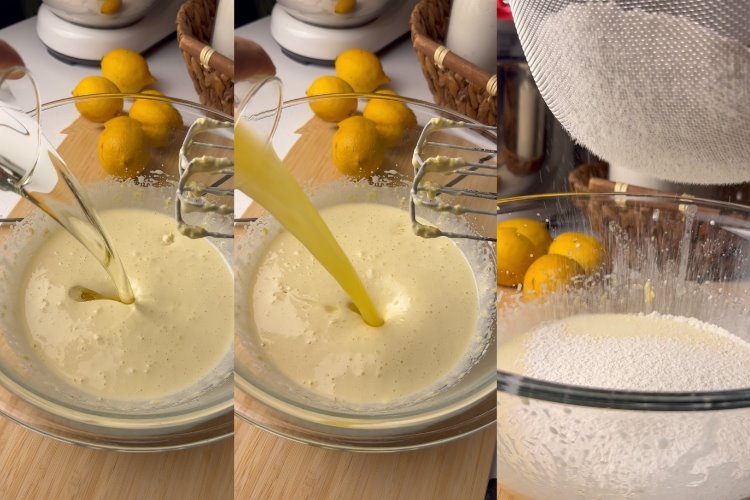 Önce sıvı malzemeleri sonra da kuruları eleyerek ekliyoruz. Bu aşamada çırpıcıyla karıştırıyoruz.