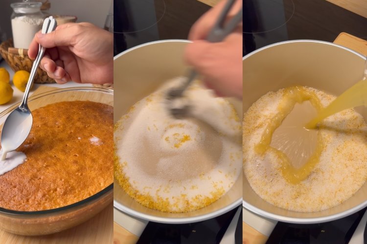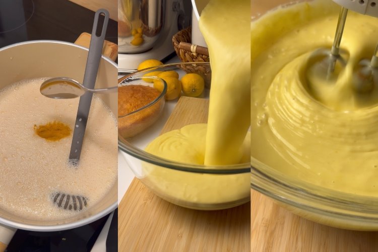 Krema için; tencereye şeker, limon ve limon suyunu alıp karıştırıyoruz. Yumurta sarısı ve unu da ilave edip karıştırıyoruz. (Tanecikli olacaktır, hiç sorun değil) Sıvı malzemeleri karıştırarak ekleyip karışımı açıyoruz. Orta ateşte puding kıvamına gelene kadar pişiriyoruz. Soğuyunca mikserle çırpıp kekin üzerine döküyoruz.